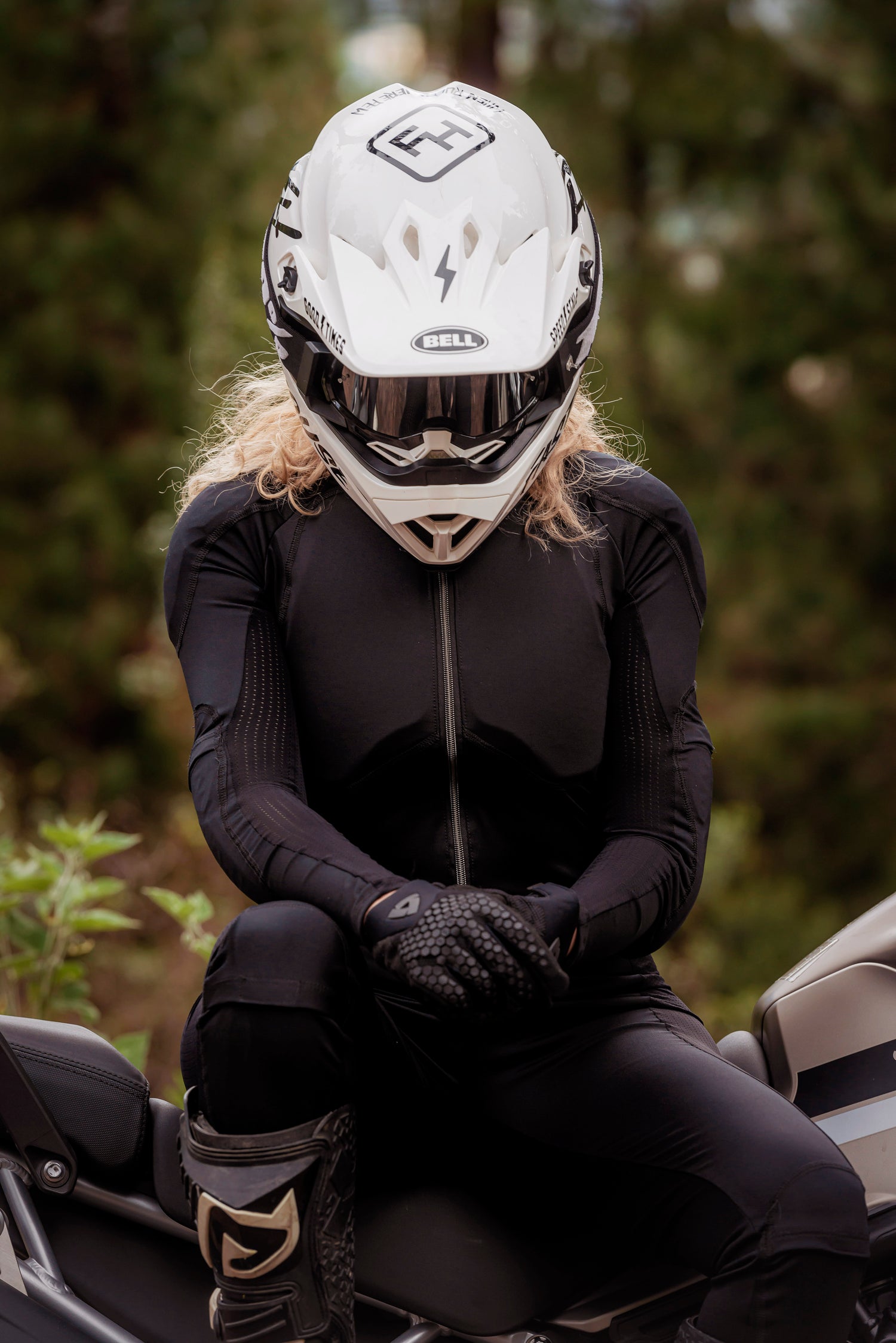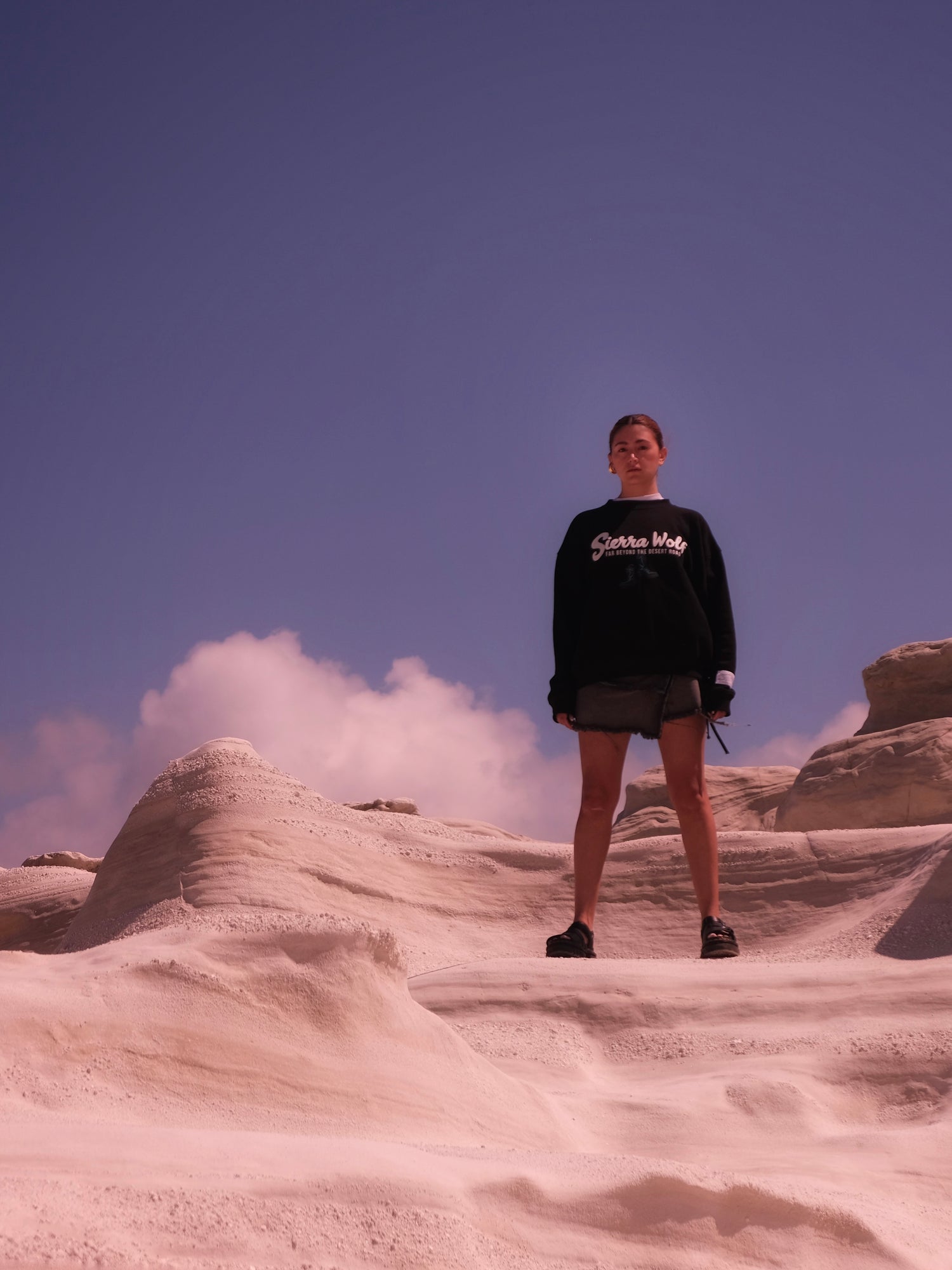 Sierra Wolf es la materialización de todo eso. En nuestra última colección y quizás la más personal, quería alejarme de los gráficos obvios de la tipica moto estampada. Quería contar una historia, crear un personaje que representará esa sensación que te da estar en moto, fuera de la carretera, fuera de las normas, fuera de lo común. Sierra Wolf es una loba, un animal salvaje, fuerte, libre y tenaz. Ella es una vaquera que habita la superficie lunar y ama las motos. Los estampados de la colección narran momentos de su vida, su sofá en medio del desierto lunar, con repuestos de motos botados por ahí, el plano de su garaje, su estación de mantenimiento con aceite, lubricante de cadena, filtros de aceite y pastillas de freno. Sierra Wolf no le teme al barro ni ensuciarse, es feroz, sensible, salvaje y real como tú, como yo.